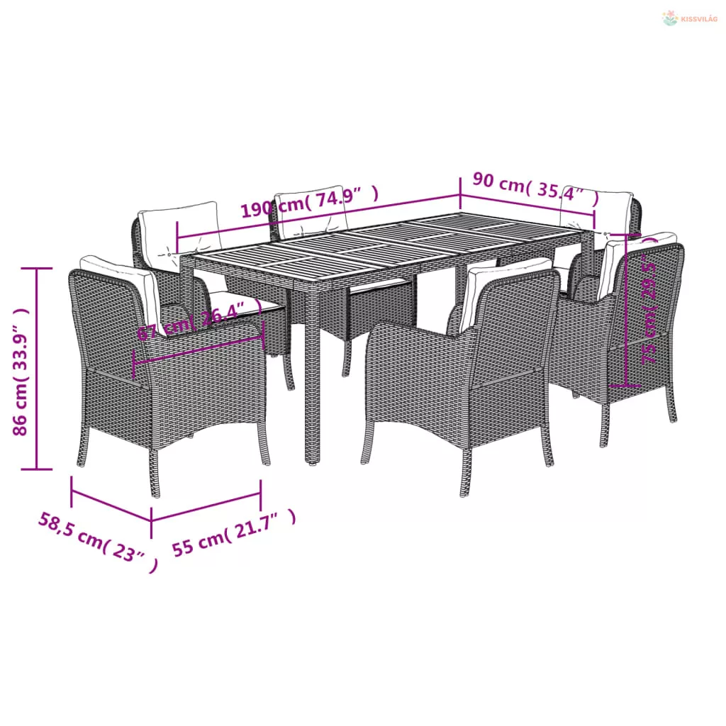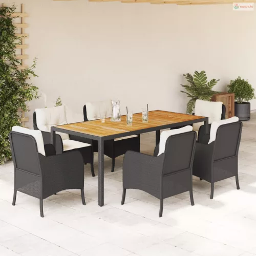 7 részes fekete polyrattan kerti étkezőgarnitúra párnával