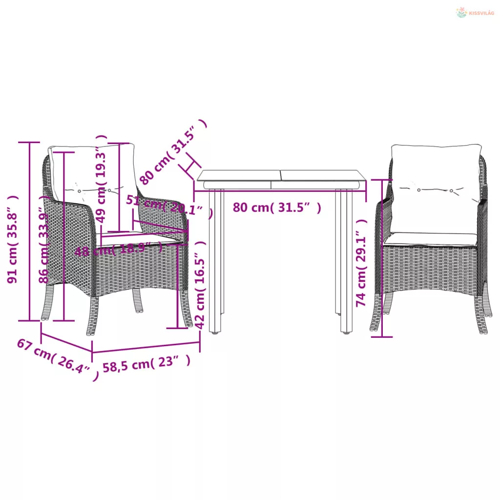 3 részes világosszürke polyrattan kerti étkezőgarnitúra párnával