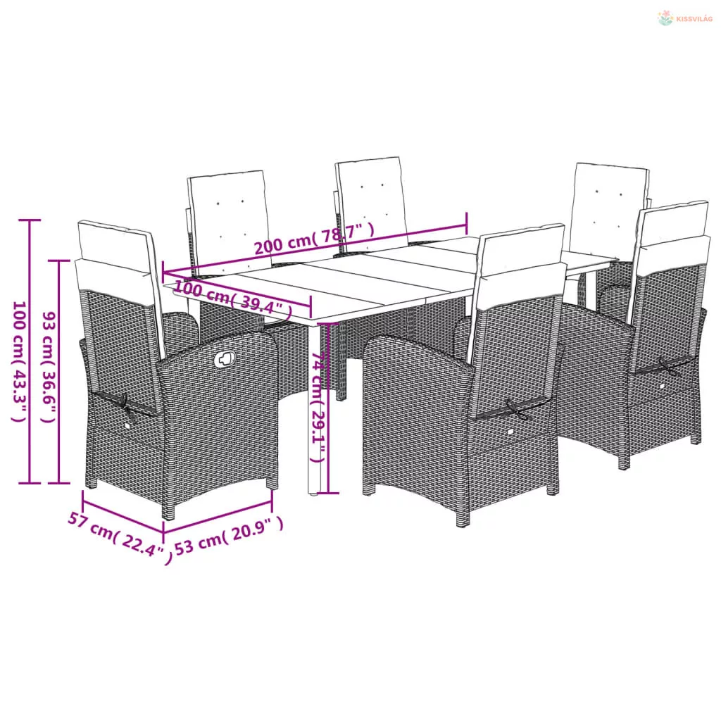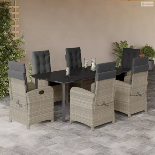 7 részes világosszürke polyrattan kerti étkezőszett párnával