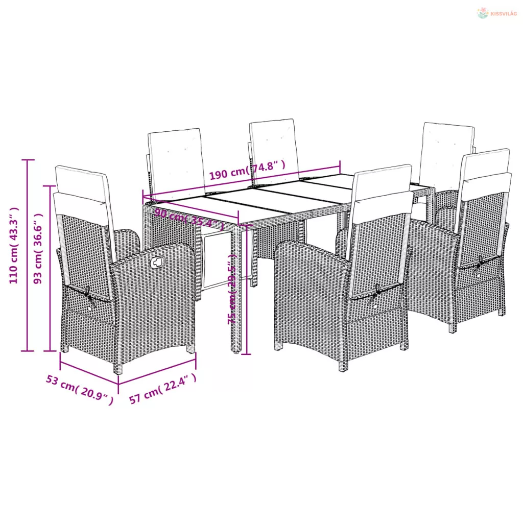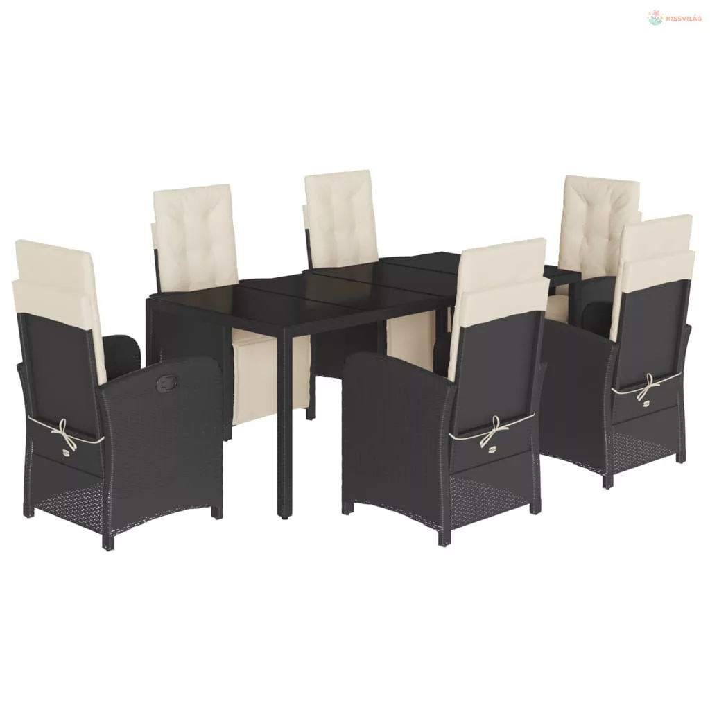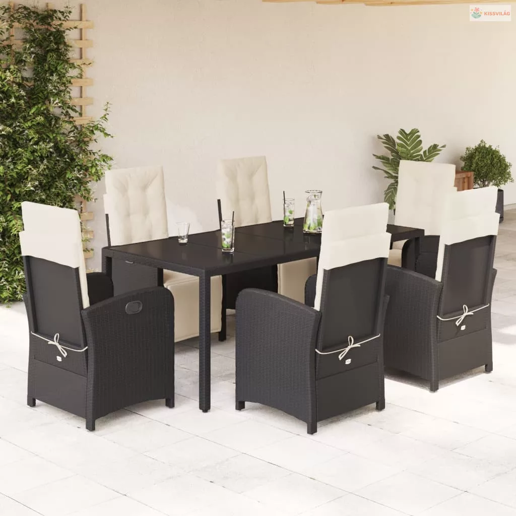 7 részes fekete polyrattan kerti étkezőgarnitúra párnával