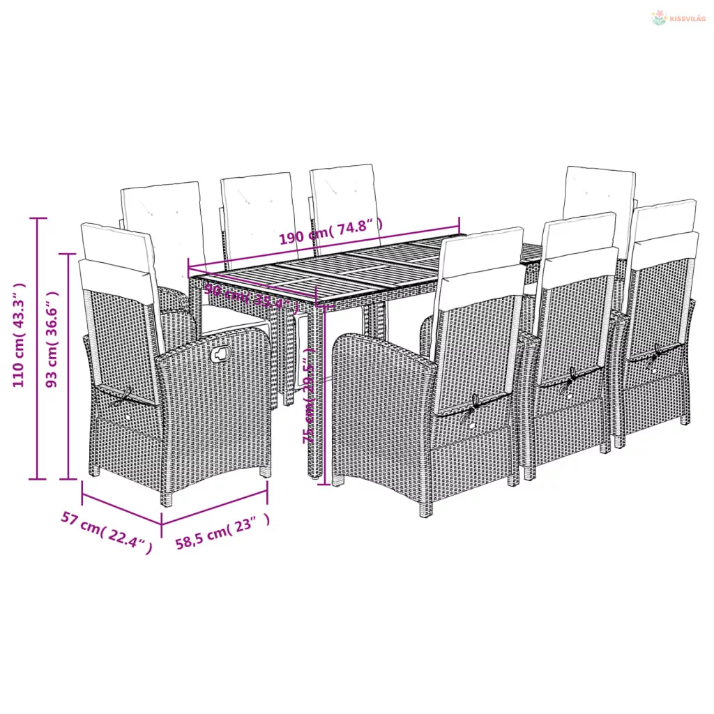 9 részes fekete polyrattan kerti étkezőgarnitúra párnákkal
