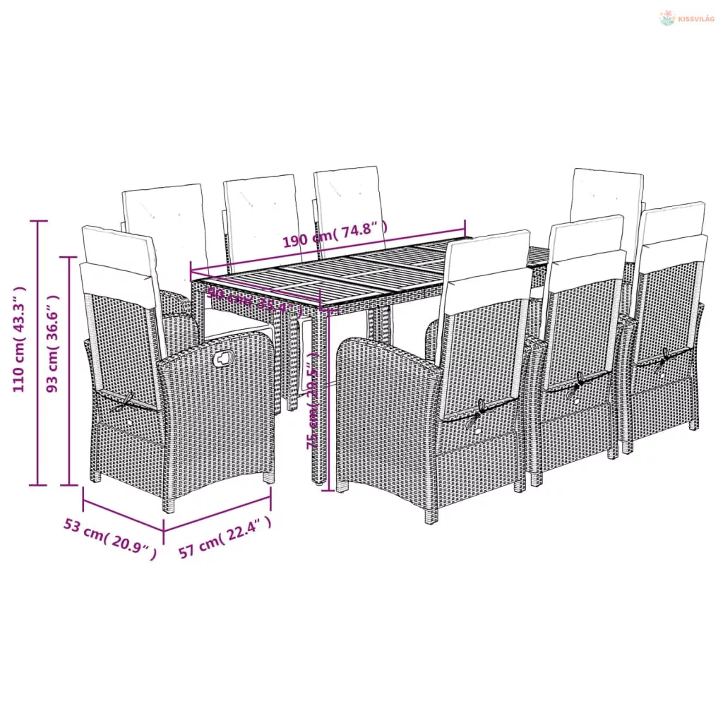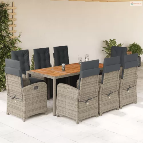 9 részes szürke polyrattan kerti étkezőgarnitúra párnával