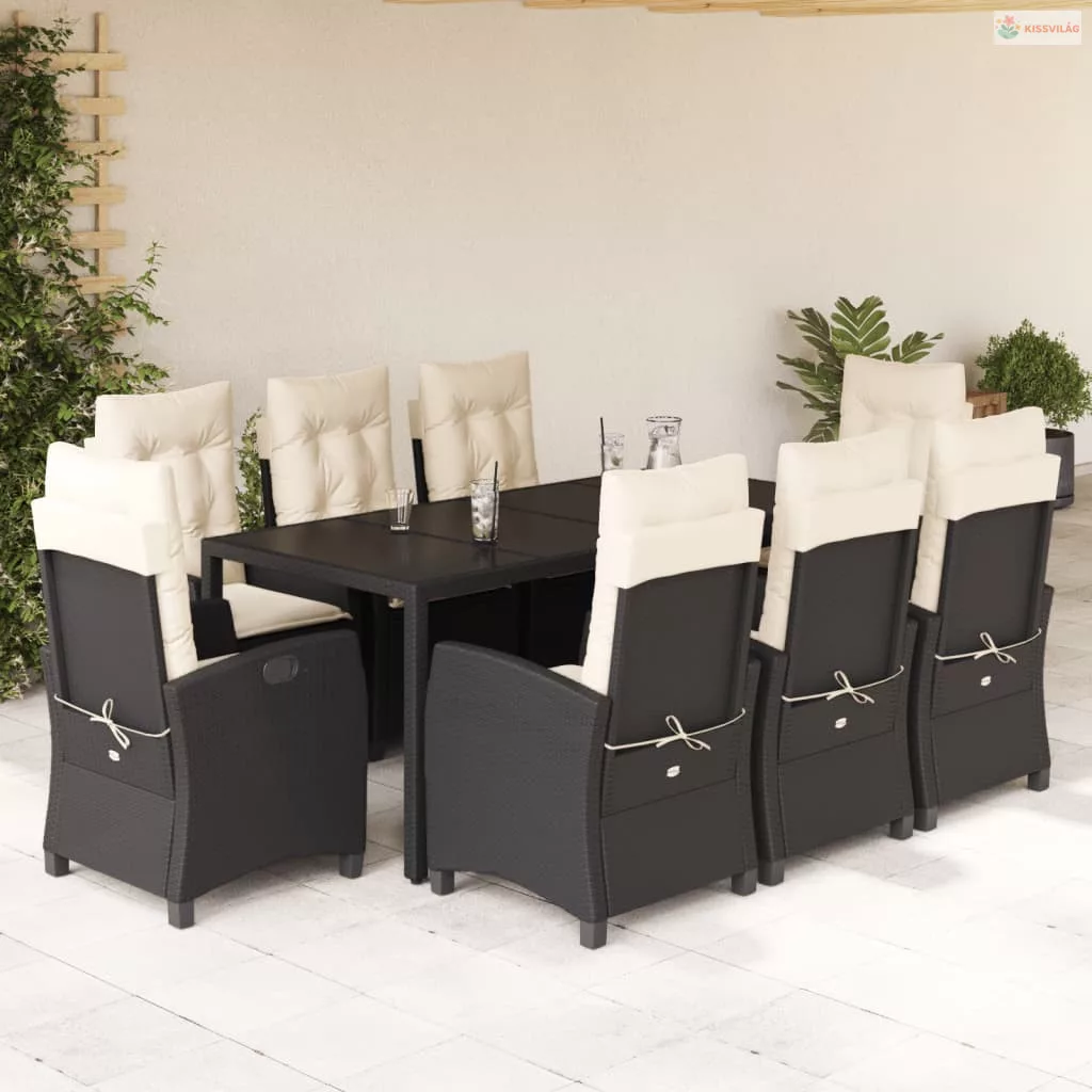 9 részes fekete polyrattan kerti étkezőgarnitúra párnákkal