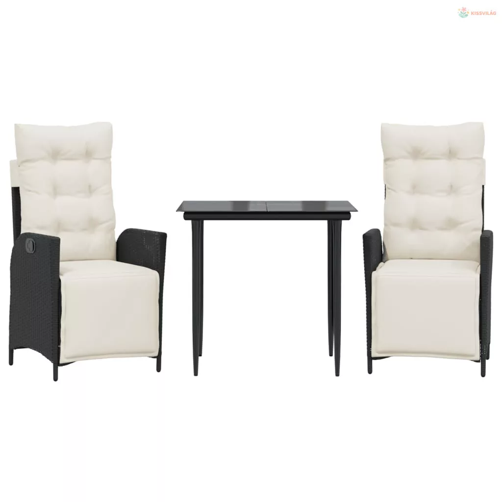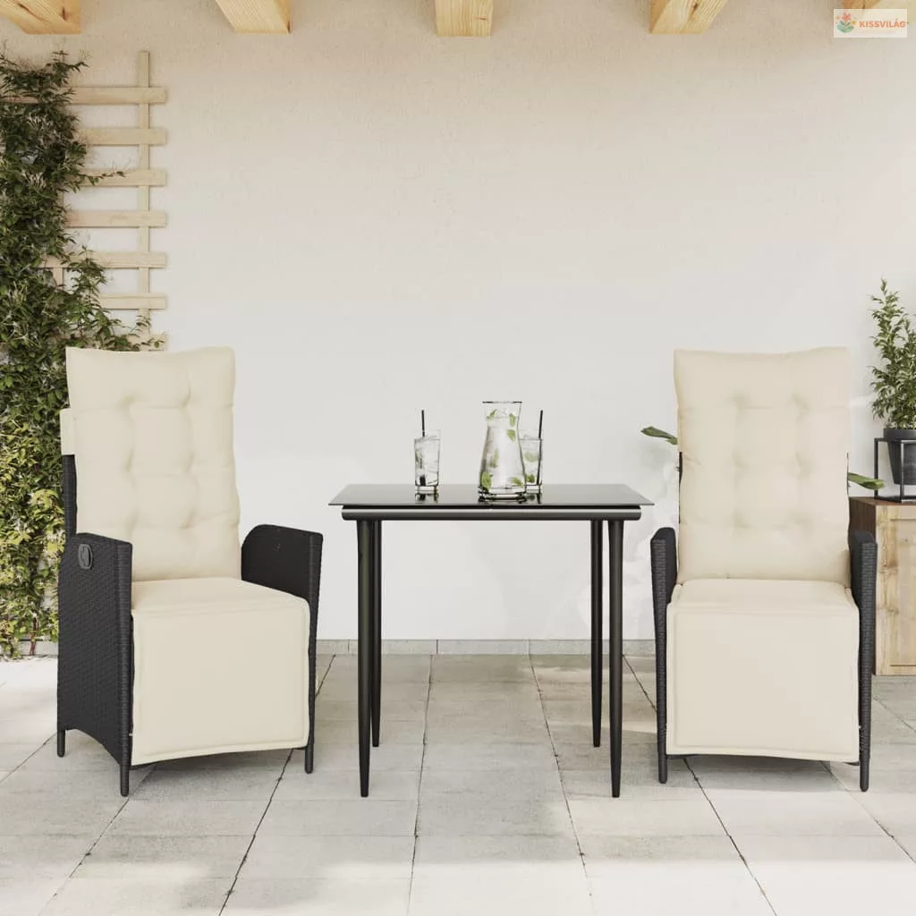 3 részes fekete polyrattan kerti étkezőgarnitúra párnákkal