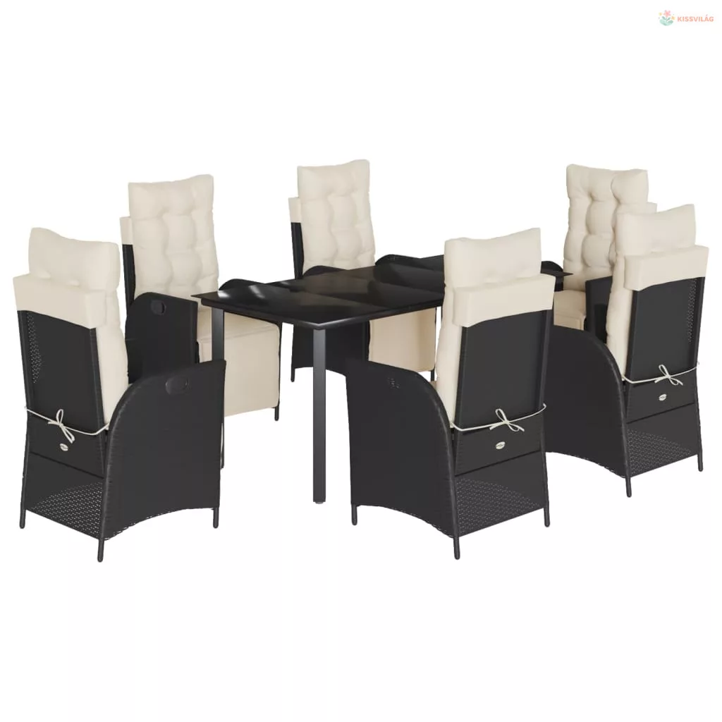 7 részes fekete polyrattan kerti étkezőgarnitúra párnával