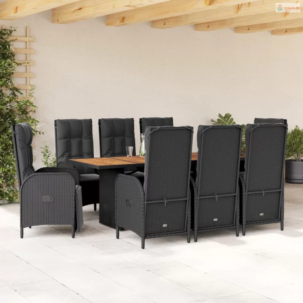 9 részes fekete polyrattan kerti étkezőgarnitúra párnákkal