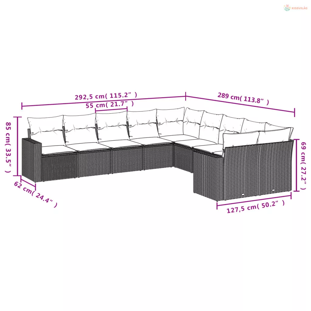 10 részes fekete polyrattan kerti ülőgarnitúra párnával