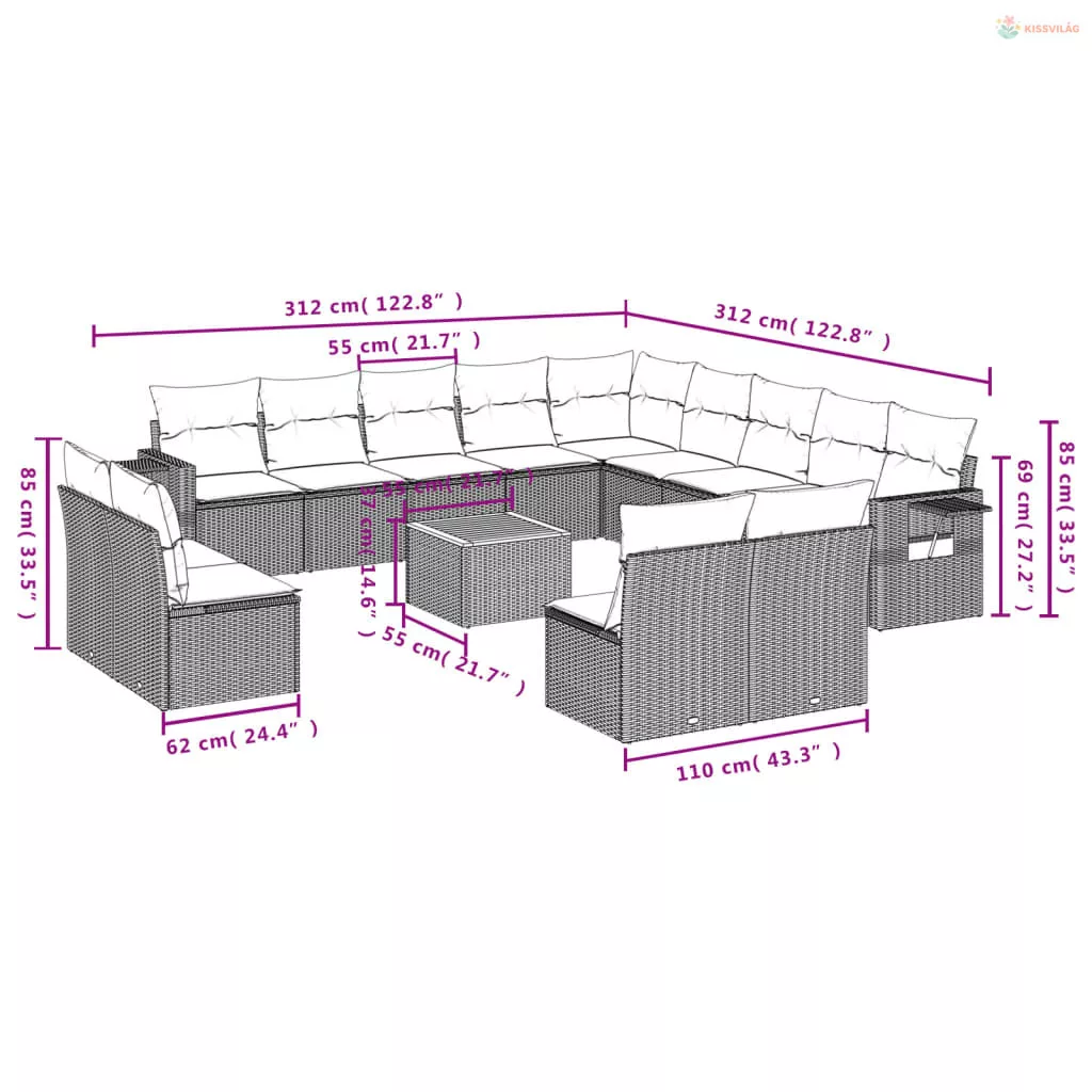 14 részes szürke polyrattan kerti ülőgarnitúra párnákkal