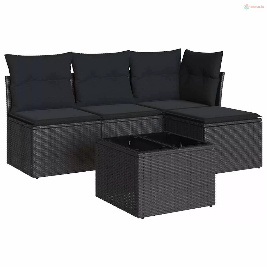 5 részes fekete polyrattan kerti kanapészett párnákkal
