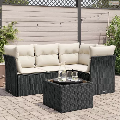 5 részes fekete polyrattan kerti kanapészett párnákkal