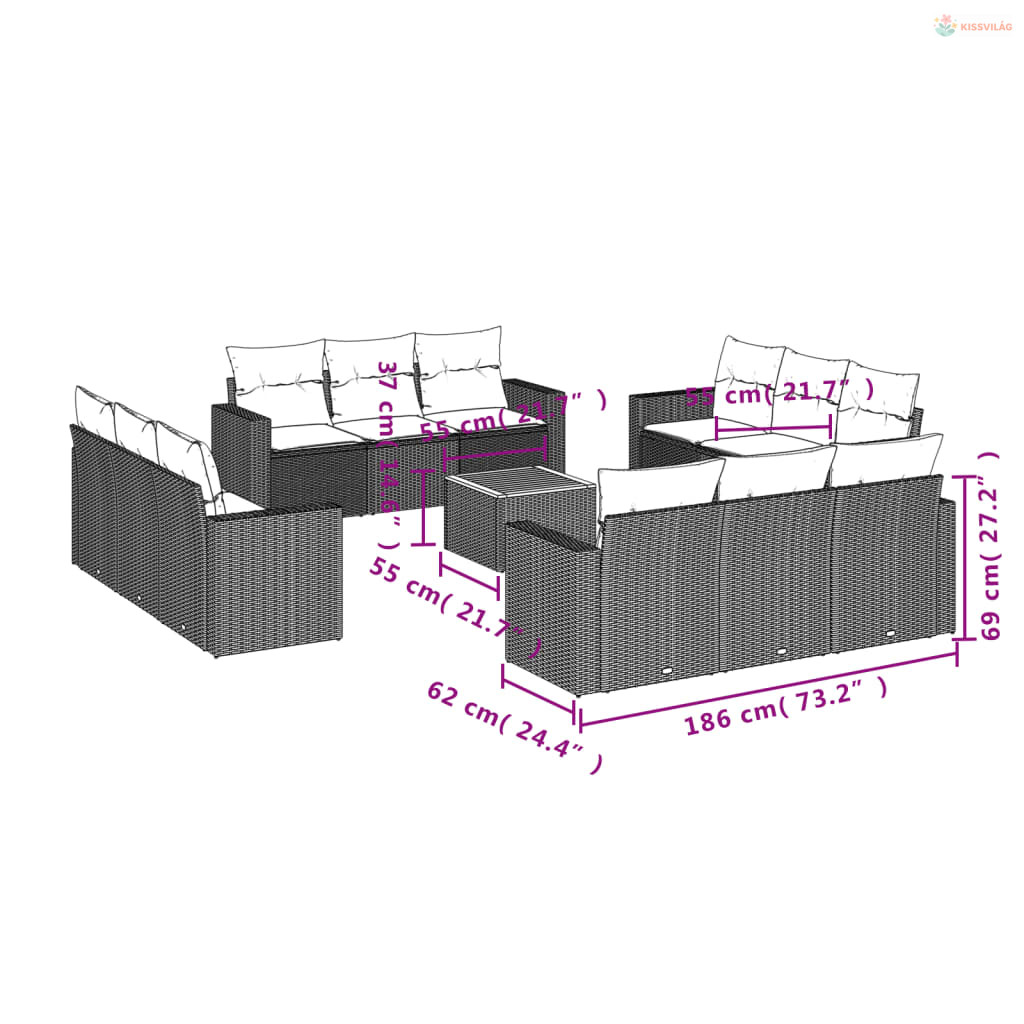 13 részes fekete polyrattan kerti ülőgarnitúra párnákkal