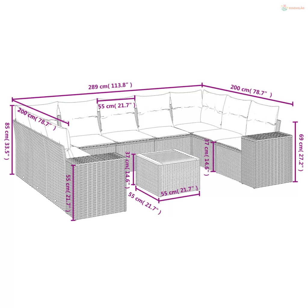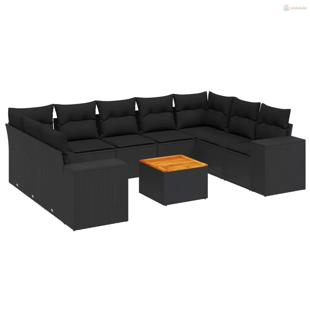 10 részes fekete polyrattan kerti ülőgarnitúra párnákkal