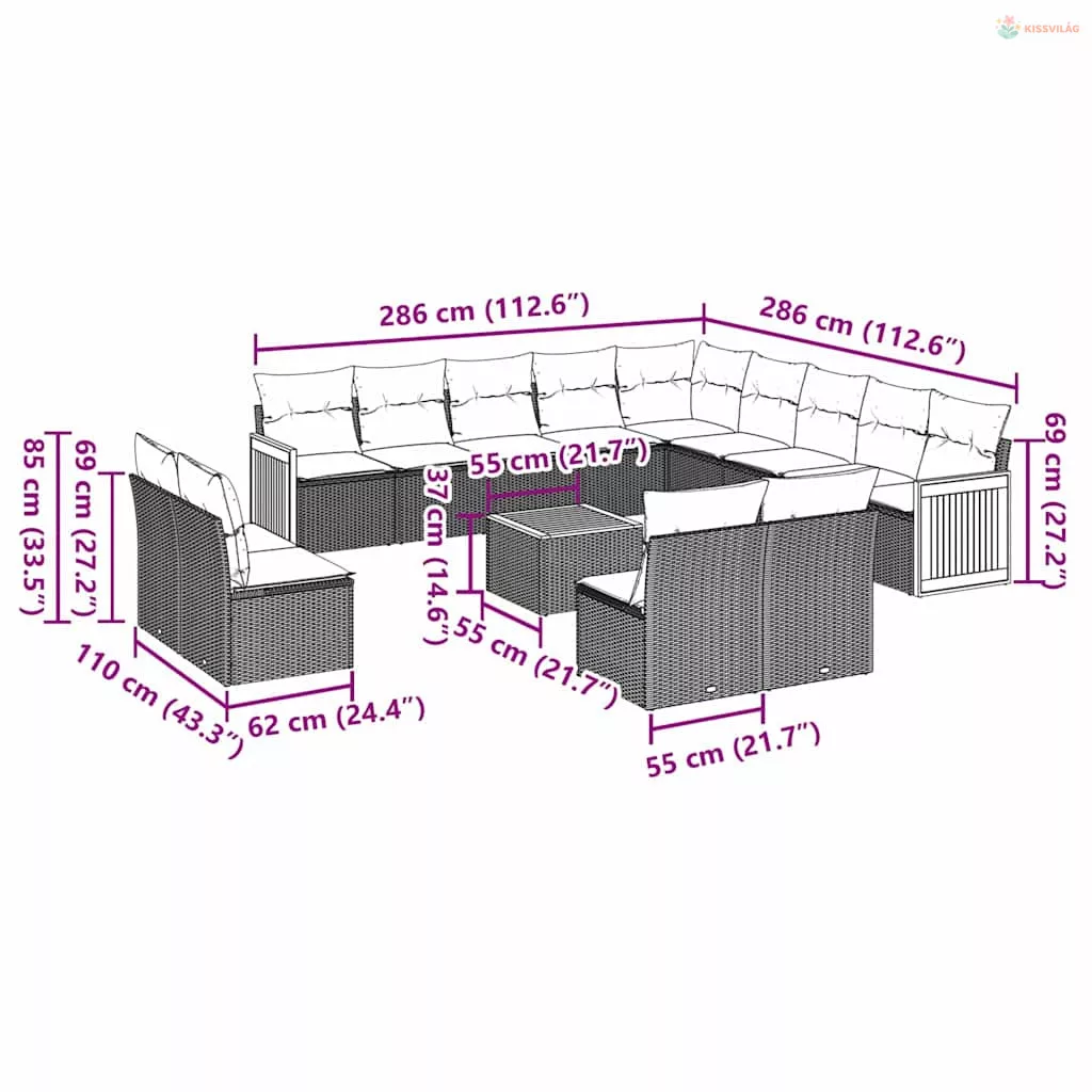 14 részes fekete polyrattan kerti ülőgarnitúra párnákkal