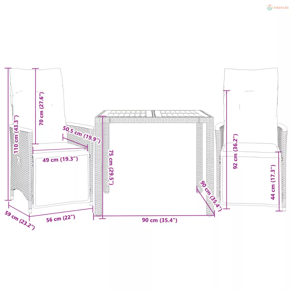 3 részes fekete polyrattan kerti bisztrógarnitúra párnákkal
