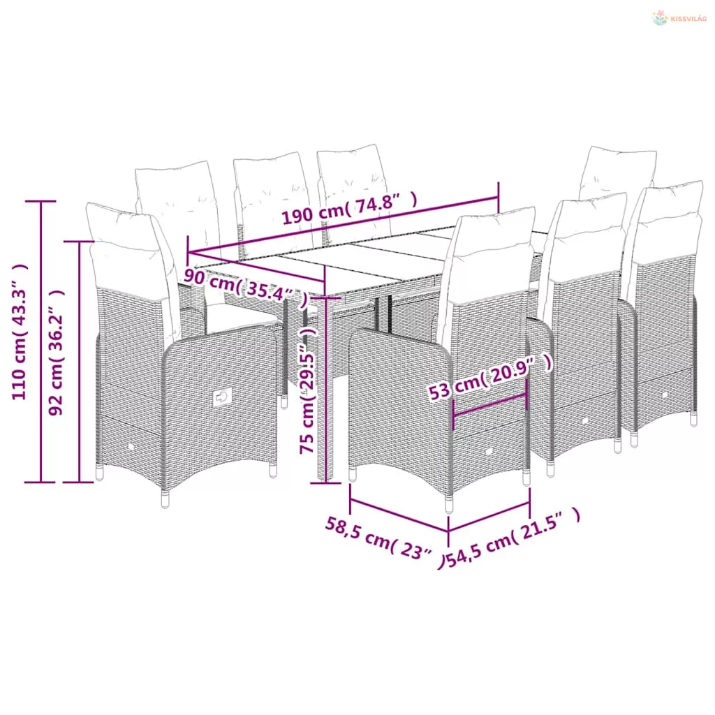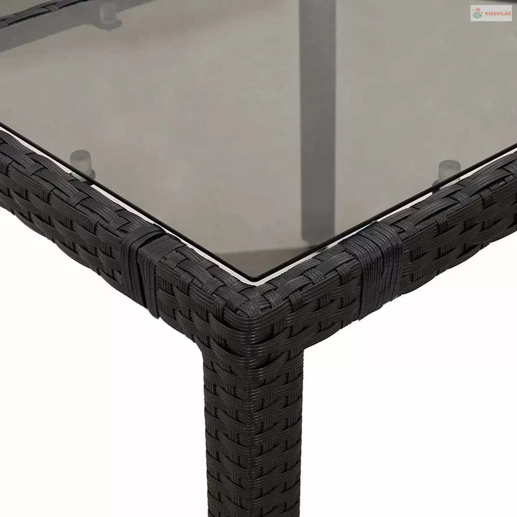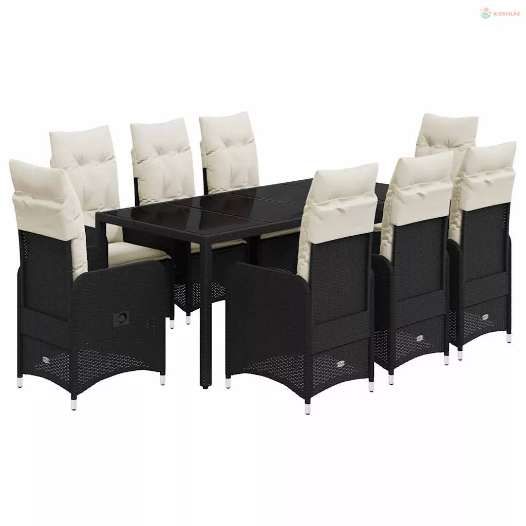 9 részes fekete polyrattan kerti bisztrógarnitúra párnákkal
