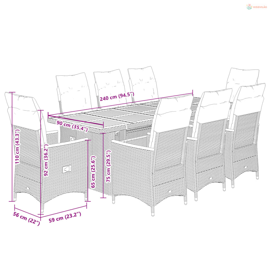 9 részes fekete polyrattan kerti bisztrógarnitúra párnákkal
