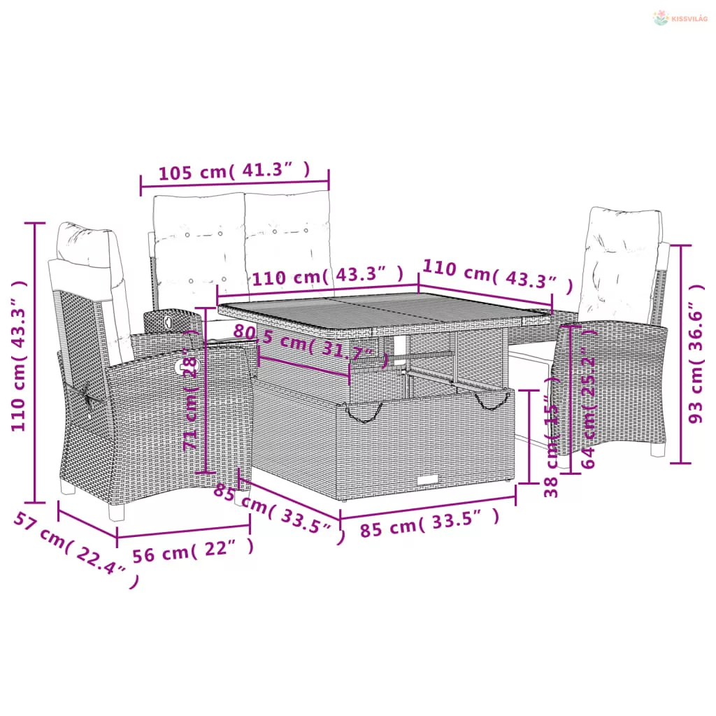 4 részes fekete polyrattan kerti étkezőszett párnákkal