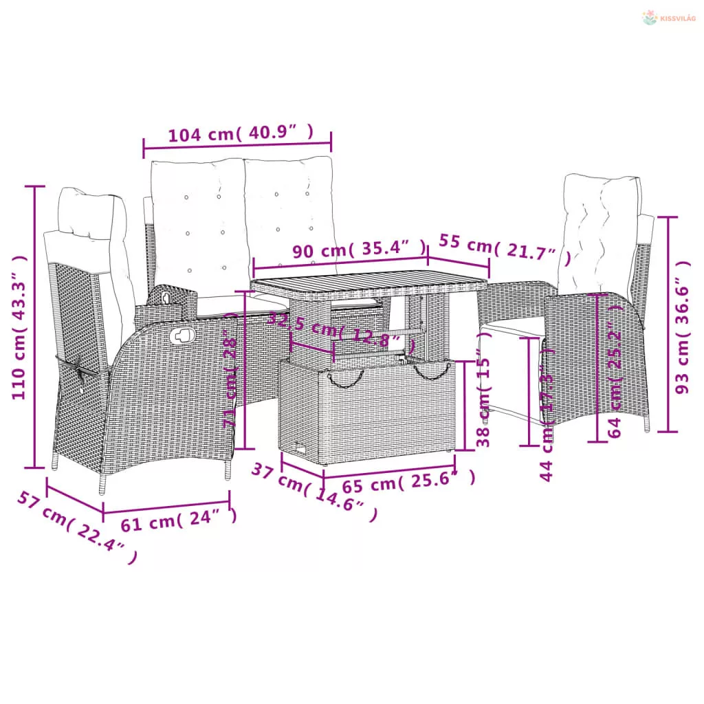 • Ülőméretek: 104 x 59 x 93 cm (Szé x Mé x Ma)