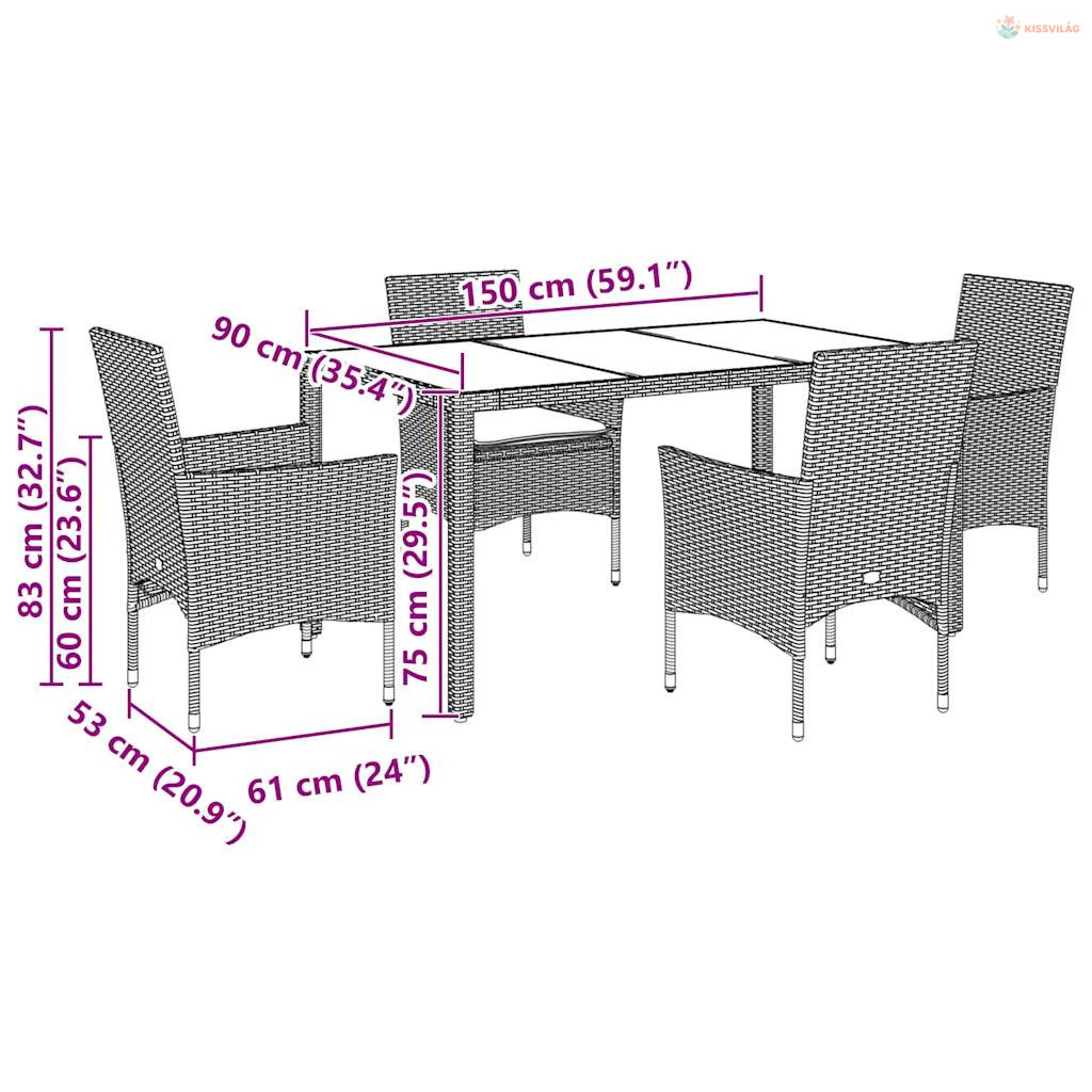 5 részes szürke polyrattan/üveg kerti étkezőgarnitúra párnával