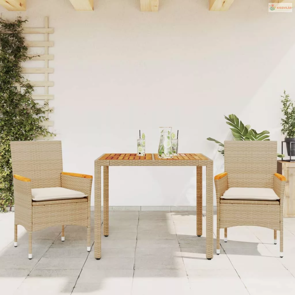 3 részes bézs polyrattan/akácfa kerti étkezőgarnitúra párnákkal
