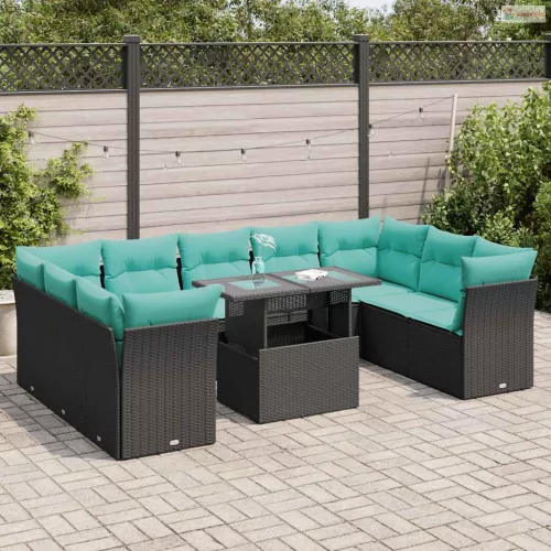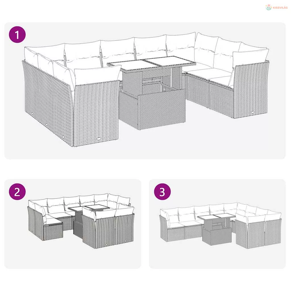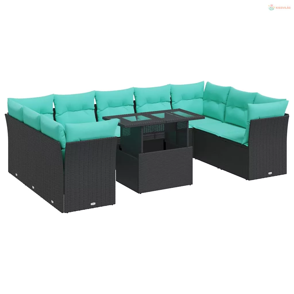 10 részes fekete polyrattan akácfa kerti ülőgarnitúra párnákkal
