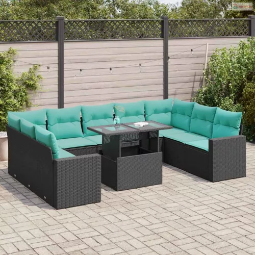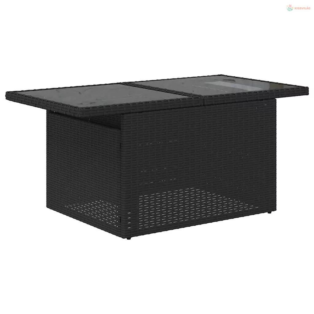 10 részes fekete polyrattan akácfa kerti ülőgarnitúra párnákkal