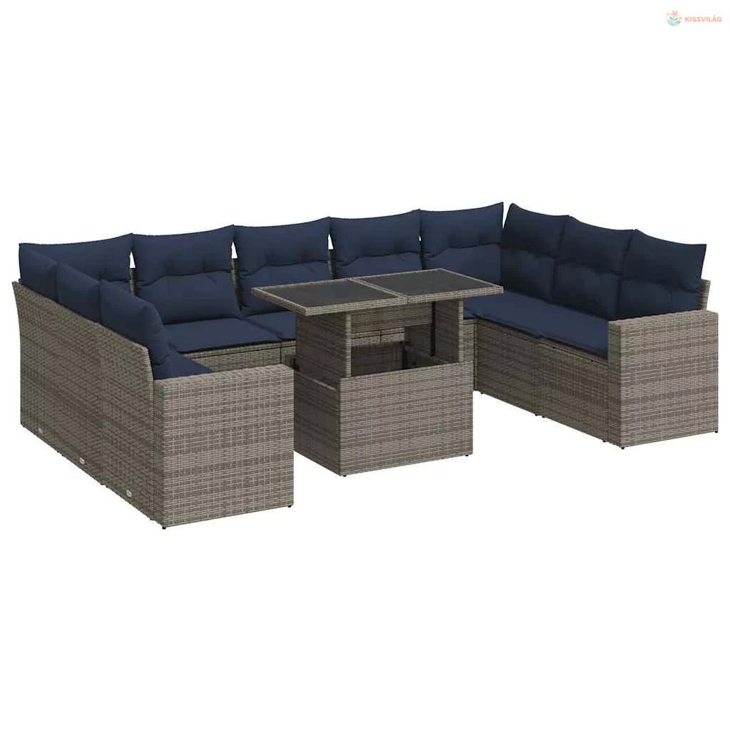 10 részes szürke polyrattan akácfa kerti ülőgarnitúra párnákkal