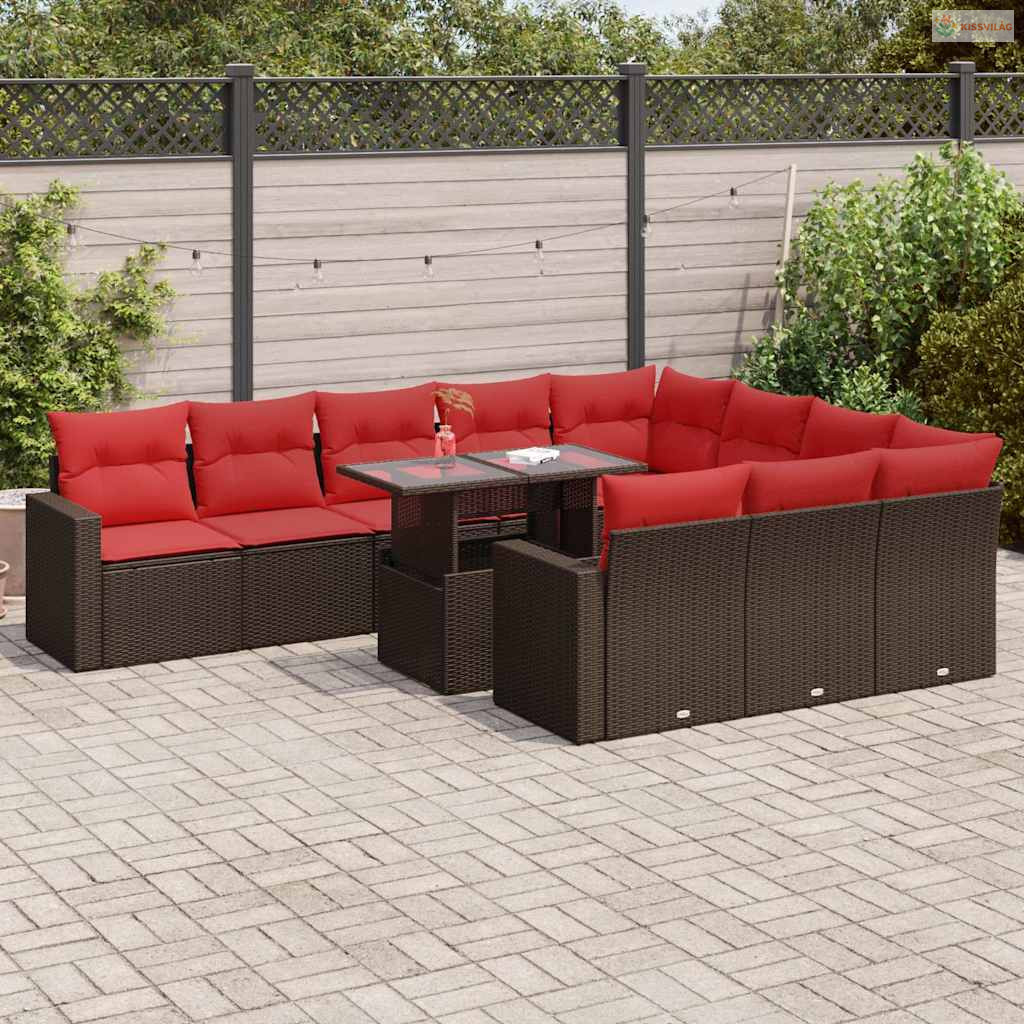 11 részes barna polyrattan akácfa kerti ülőgarnitúra párnákkal
