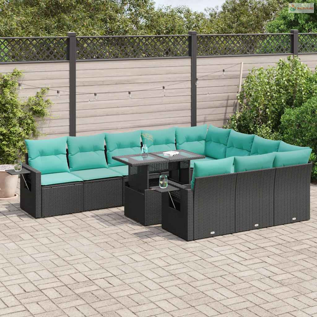 11 részes fekete polyrattan akácfa kerti ülőgarnitúra párnákkal