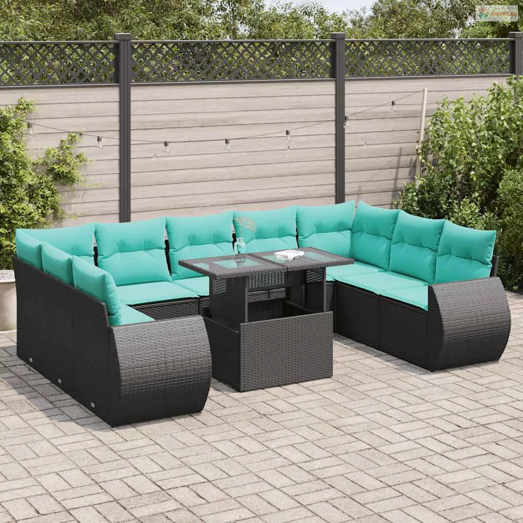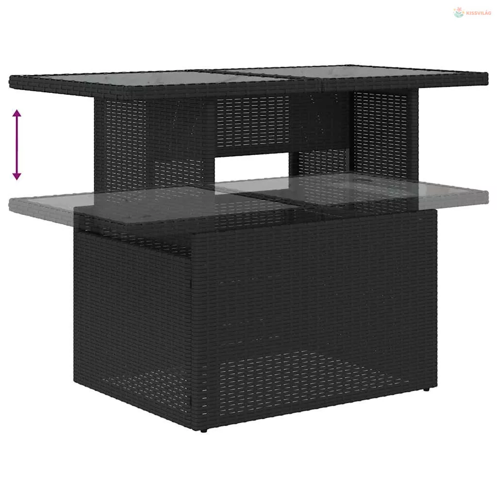 10 részes fekete polyrattan akácfa kerti ülőgarnitúra párnákkal