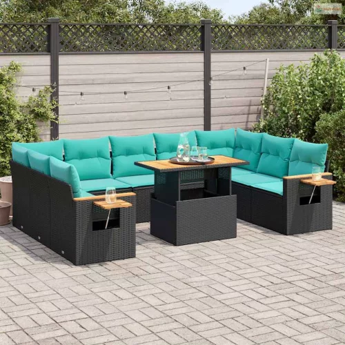 10 részes fekete polyrattan akácfa kerti ülőgarnitúra párnákkal