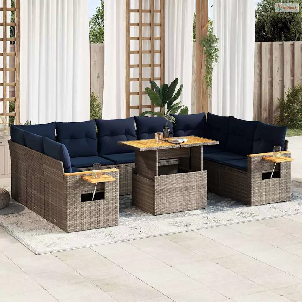 10 részes szürke polyrattan akácfa kerti ülőgarnitúra párnákkal