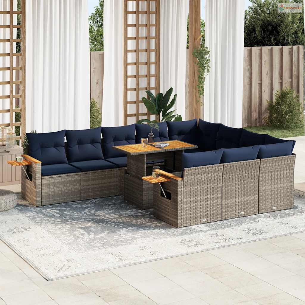 11 részes szürke polyrattan akácfa kerti ülőgarnitúra párnákkal
