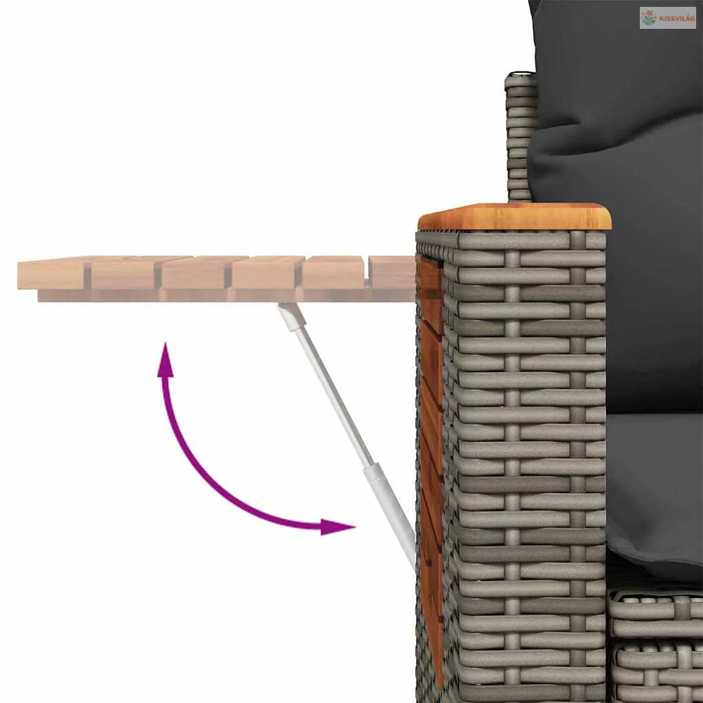 • Beépített alkatrészek: A szett tartalmaz egy kényelmes kültéri párnát, időjárásálló anyagból készült, hosszú távú használatra. Levehető, így könnyű tisztítani és karbantartani. A polirattan háttámla és karfák ergonomikus támogatást adnak, rugalmasan használhatók pihenésre és szabadidő eltöltésére.