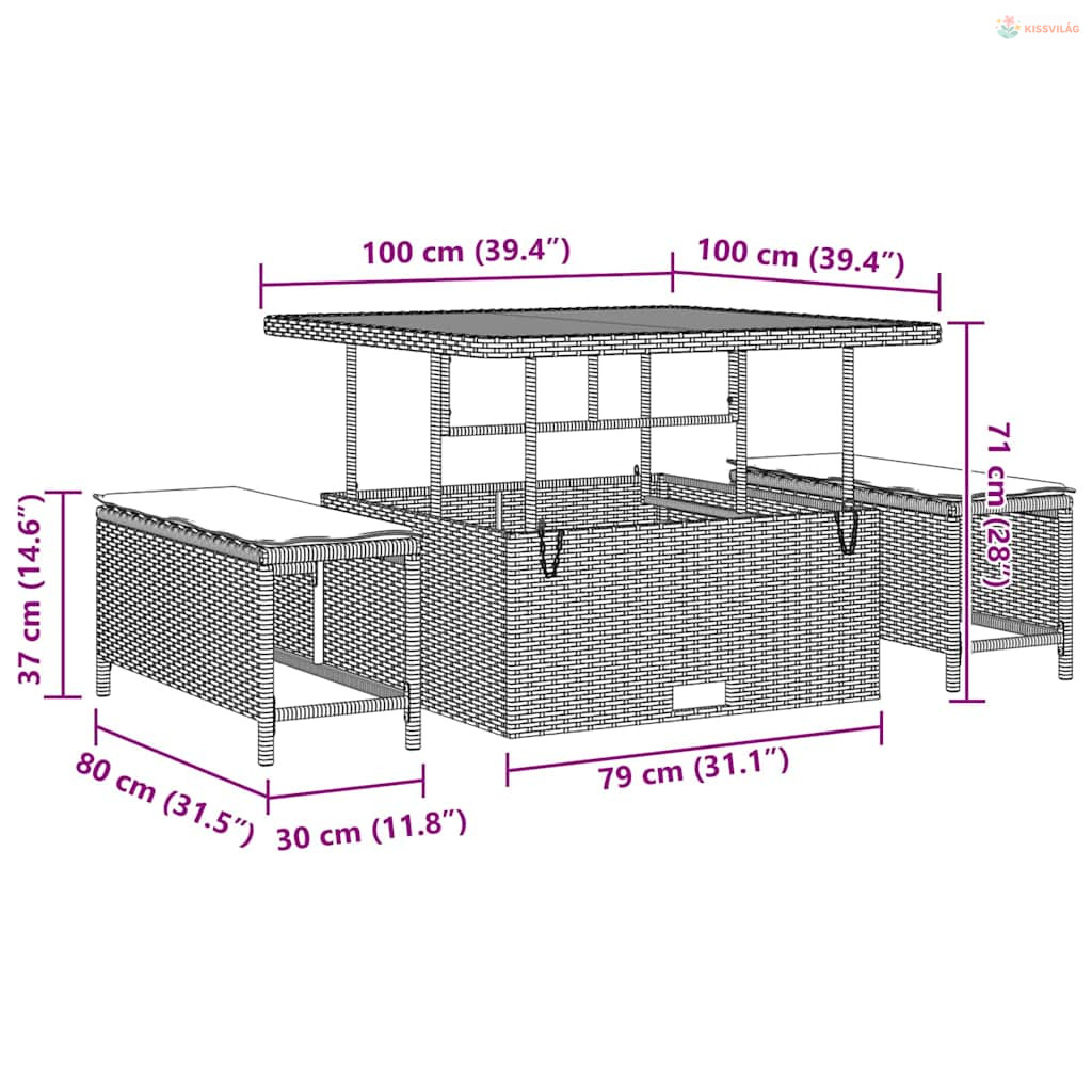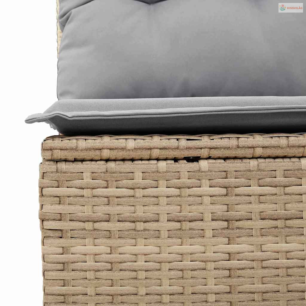 • Beépített elemek: A szett kényelmes ülést biztosít, lapos kartámmal, ami polirattanból készült, így lazán és ergonomikusan illeszkedik. Minden rész jól párnázott kültéri párnákkal van ellátva, amik könnyen levehetők mosás vagy csere céljából, így egyszerűen megőrizheti a higiéniáját. Az ülésfelület elegáns barna akácfa, stabil platformot nyújtva a italoknak vagy dekorációknak.