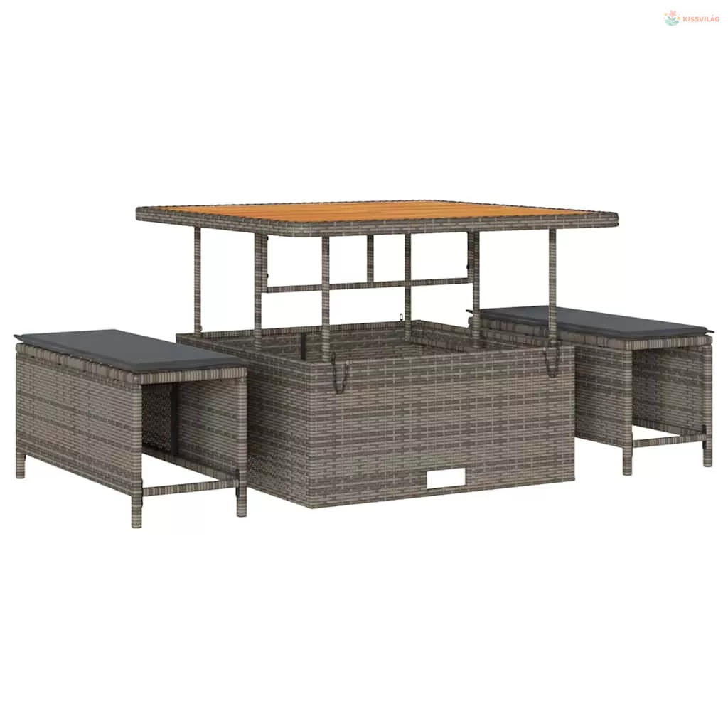 • Anyag Kombináció: A polirattan és a porszórt acél együtt remekül néz ki, miközben ellenáll az időjárásnak. A felületeket stílusos akácfa díszíti, varázst adva a kertedhez vagy teraszodhoz. Ezek az anyagok masszív építést alkotnak, ami tartós.