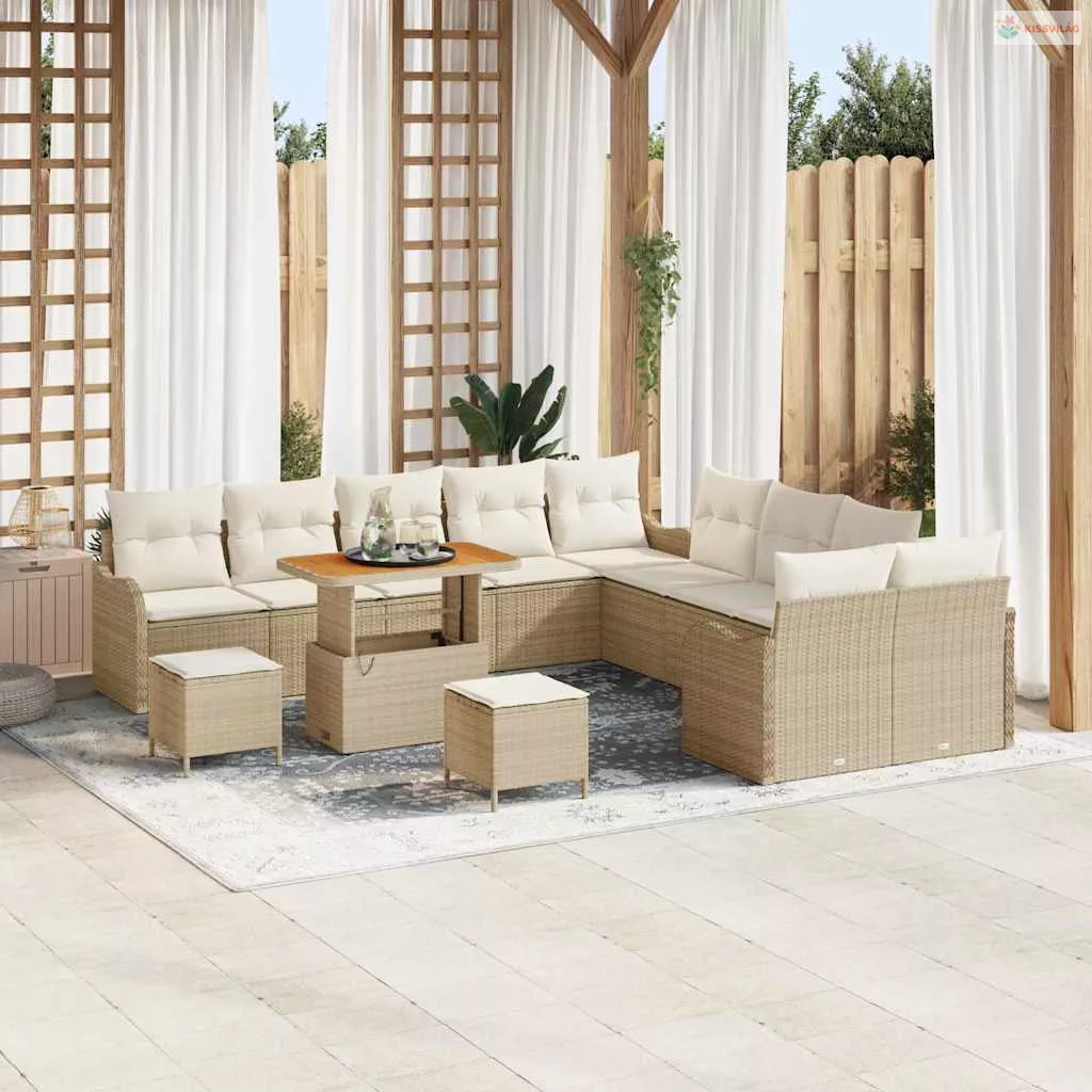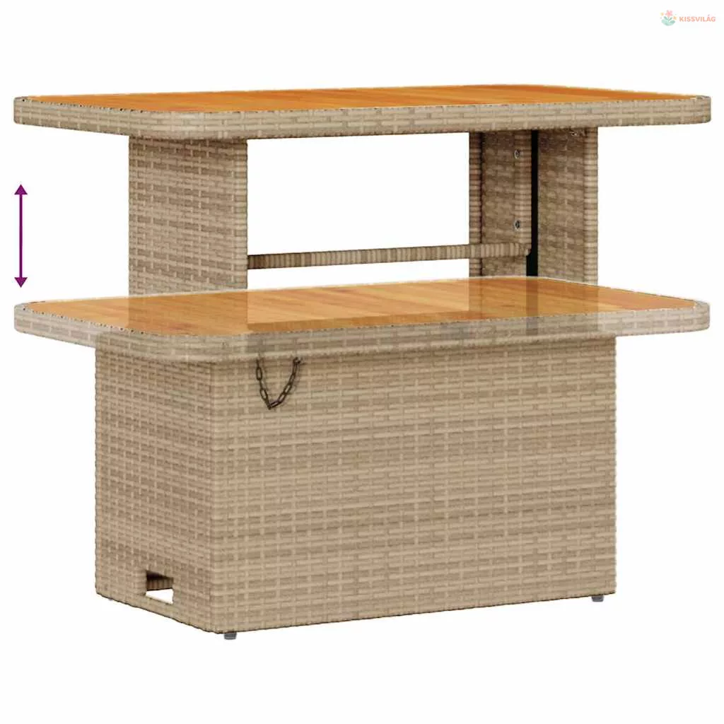 • Anyagok: Ez a bútor szett prémium polirattanból készült, jól néz ki, és ellenáll az UV-sugárzásnak meg más időjárási viszontagságoknak. Az alapja porszórt acél, ami könnyű, de erős, nem rozsdásodik vagy korrodálódik könnyen. A tömör akácfa díszítések természetes hangulatot adnak, és növelik a tartósságot.