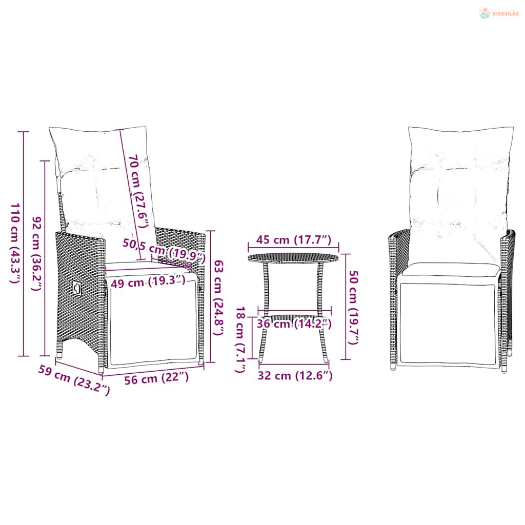 3 darabos szürke polyrattan bisztrógarnitúra párnákkal