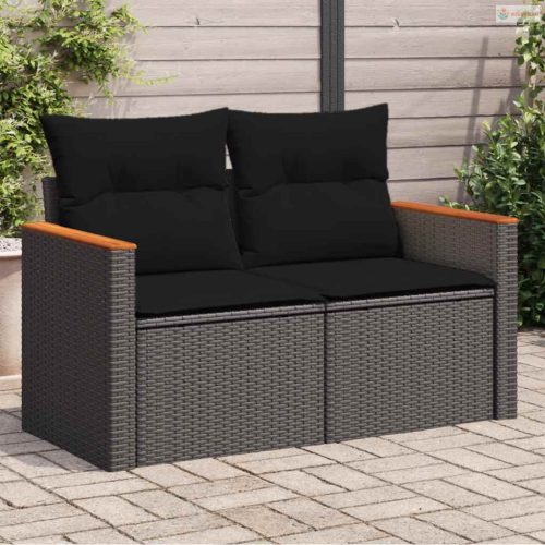 Kétszemélyes fekete polyrattan kerti kanapé párnákkal
