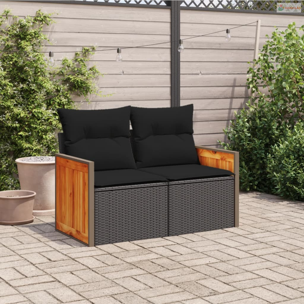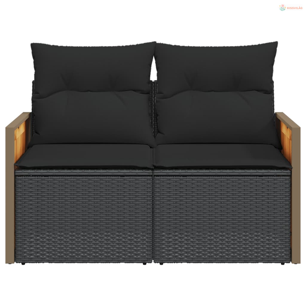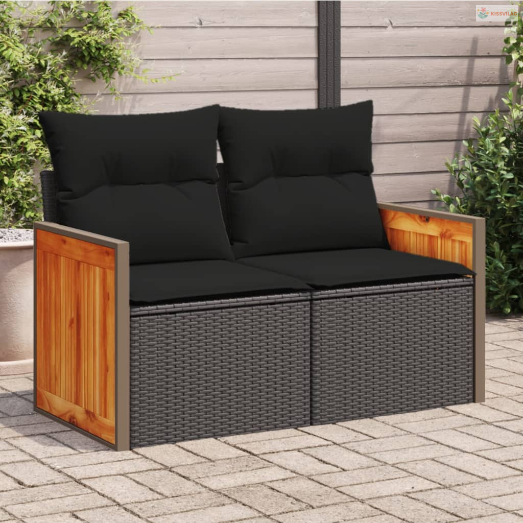 2 személyes fekete polyrattan kerti kanapé párnával