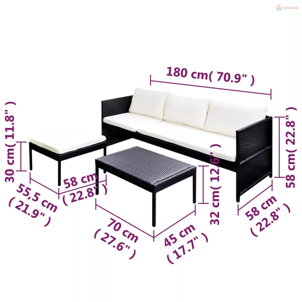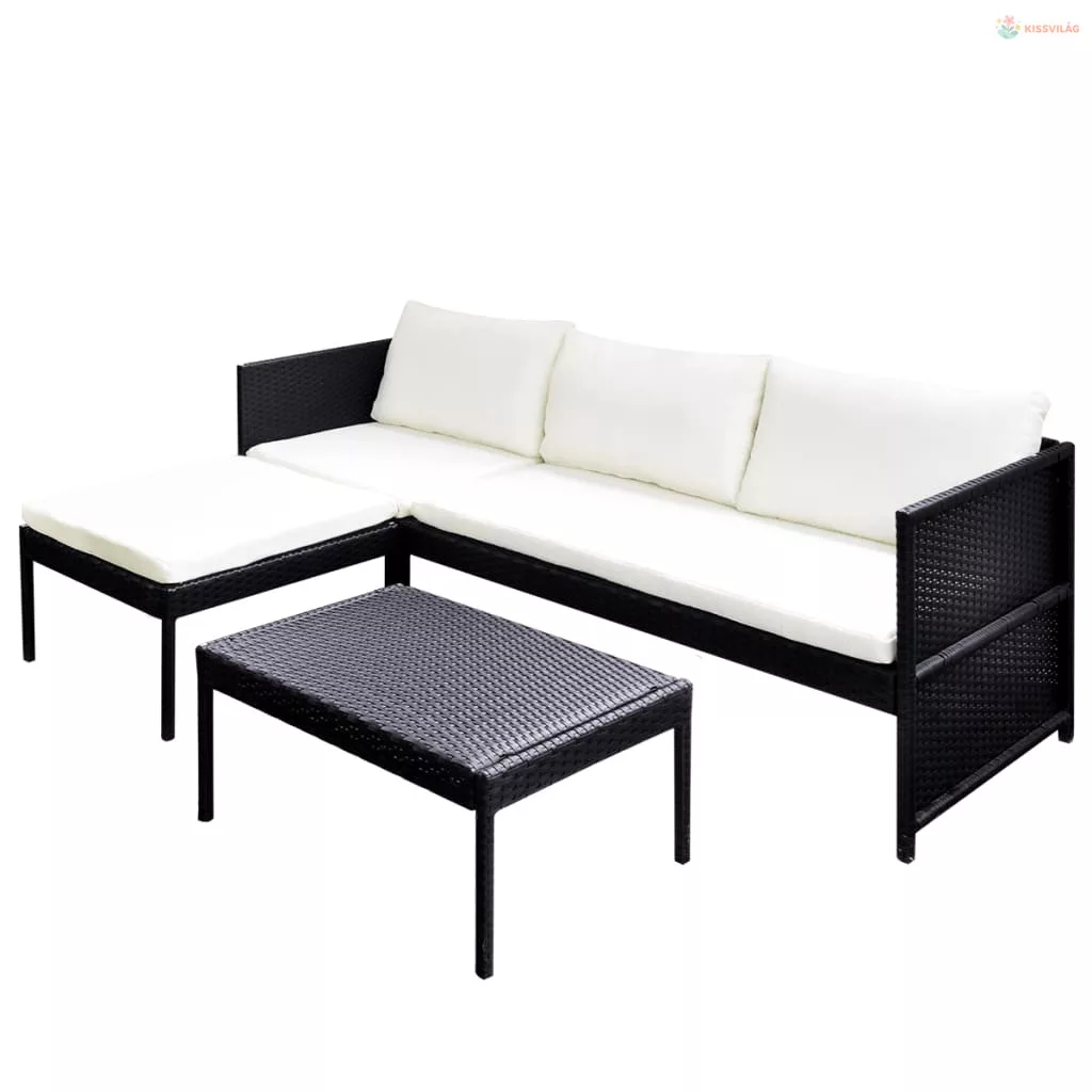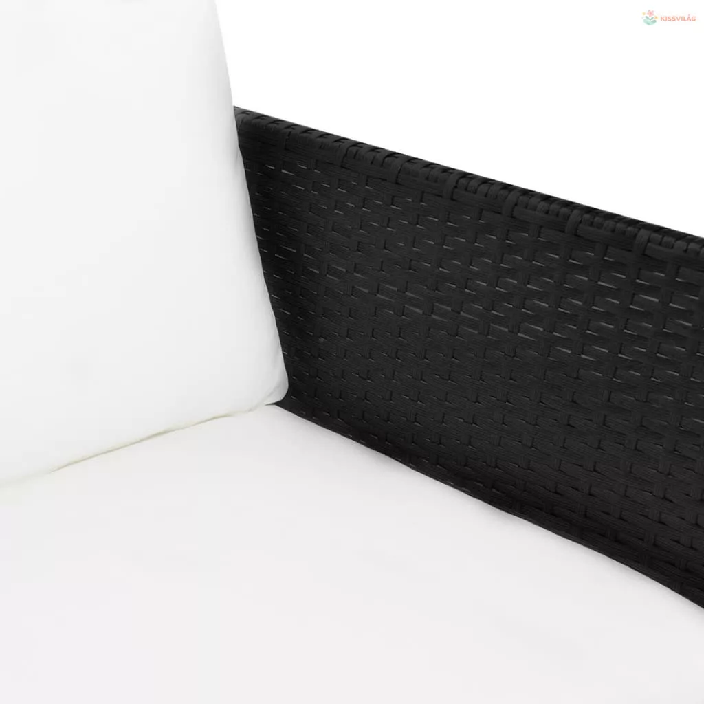 3 részes fekete polyrattan kerti bútorszett párnákkal
