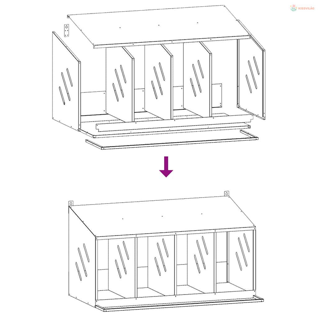 • A sügér bejáratának kialakítása: A beépített sügér megkönnyíti a tyúkok számára a fészkelődobozba való be- és kilépést, elősegítve a könnyű használatot.